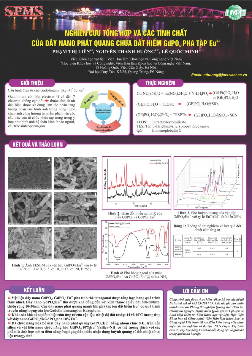 Poster báo cáo mã số D-5 của nhóm tác giả Phạm Thị Liên, Nguyễn Thanh Hường và Lê Quốc Minh (Viện Khoa học Vật liệu, Viện Hàn lâm Khoa học và Công nghệ Việt Nam) đạt Giải Nhất báo cáo treo Hội nghị SPMS 2017.